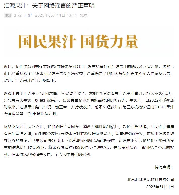 5月11日,北京汇源食品饮料有限公司发布声明,针对网络上关于汇源果汁“走向末路、又被资本耍了、悲剧”等唱衰言论进行驳斥,强调这些信息均为恶意抹黑,旨在诋毁民营企业及民族品牌。关于汇源果汁“走向末路”的说法并非第一次出现,它显然没有走出艰难的处境,但从这些唱衰言论中,我们能感受到有些人对这家民营企业及民族品牌幸灾乐祸的浓厚恶意,这是十分要不得的。