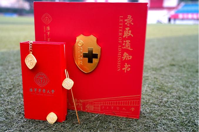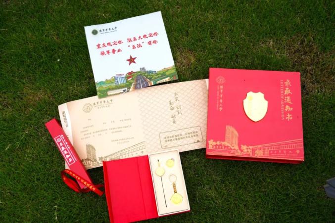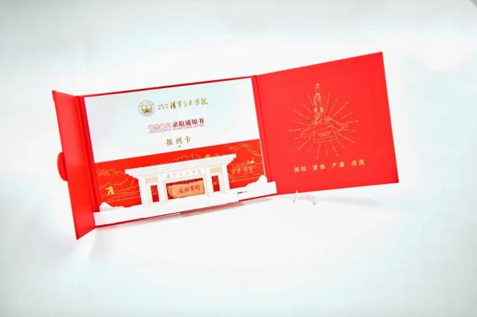 录取通知书选取中国红、军绿、金色为主色调