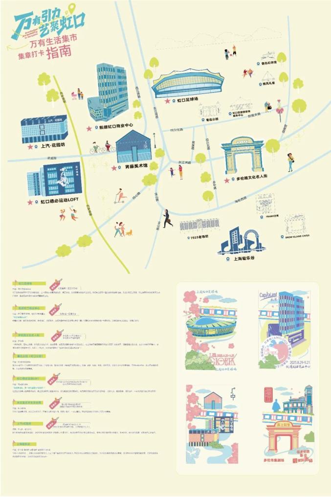 活动期间,主办方还特别推出设计精美的“万有生活集集章打卡地图”。地图以缤纷色彩与创意插画勾勒出虹口地标和打卡路线,不仅是一份游玩指引,更是一份值得收藏的艺术小品。市民游客可在虹足星聚及多个打卡点盖章留念,在一次次的印记累积中,拼凑出属于自己的夏日回忆。