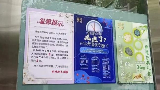 光明邨在店门口张贴新的告示店家表示,为了满足顾客的购买需求,将与公安联动,坚决打击扰乱经营秩序者,从9月1日起,鲜肉月饼每人限购5盒,蟹粉月饼每人限购2盒。目前店门口排队不长,在几十人左右,一般半小时左右就可以买到刚出锅的鲜肉月饼。