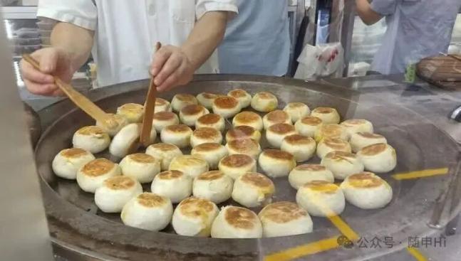光明邨月饼的特点是坚持传统平底铁锅煎制,每日限量供应。师傅每隔一段时间会揭开锅盖,翻转一下饼胚,确保每只月饼都均匀受热,刚出锅的月饼外皮金黄酥脆,内馅滚烫鲜香,如果再放上一段时间品尝,口感更佳。