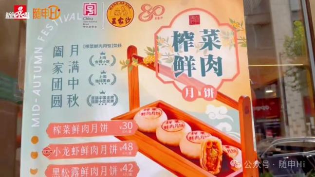 位于南京西路的中华老字号王家沙总店月饼也全线上市了,王家沙的鲜肉类月饼有榨菜鲜肉、小龙虾鲜肉、黑松露鲜肉、蟹粉鲜肉。