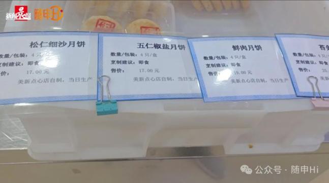 美新点心店位于威海路陕西北路口的中华老字号美新点心店,从早上8点开始营业,包括月饼在内的各式点心也摆上了柜台。美新的月饼有四种,分别是鲜肉、豆沙、椒盐、苔条,其中椒盐和苔条是9月份刚刚上市的。