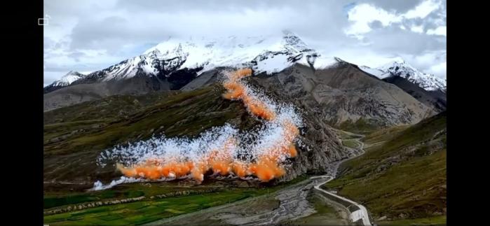 2025年9月19日,户外品牌始祖鸟联合艺术家蔡国强,在西藏喜马拉雅山脉江孜县一地区(海拔约5500米)燃放艺术烟花《升龙》,团队在一处山脊上点燃三幕烟花,形成腾飞的龙形景观。
