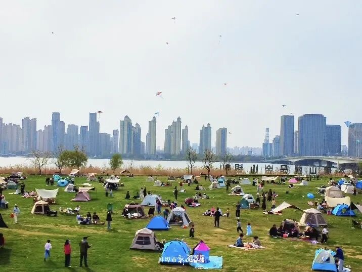 在龙子湖东公园,平坦开阔的草坪上,五颜六色的帐篷错落有致,连绵成片,场面颇为壮观。与往年零星点缀不同,如今成片的“帐篷营地”已成为湖畔一道标志性的风景线。一家人围坐帐前,铺上精致的餐垫,摆上精心准备的美食,孩子在一旁嬉戏,大人谈天说地,尽享阖家欢乐。