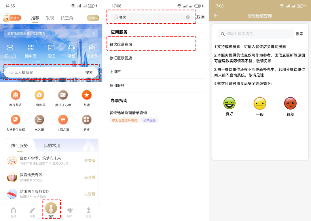 上“随申办市民云”APP→首页搜索框中输入关键字“餐饮”→点击“餐饮脸谱查询”进入服务页面。