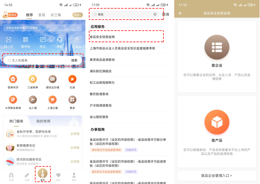 “随申办市民云”APP→首页搜索框中输入关键字“食品”→点击“食品安全信息追溯”进入服务页面,即可根据餐饮企业名称、产品条形码等,追溯查询到食品的安全信息。