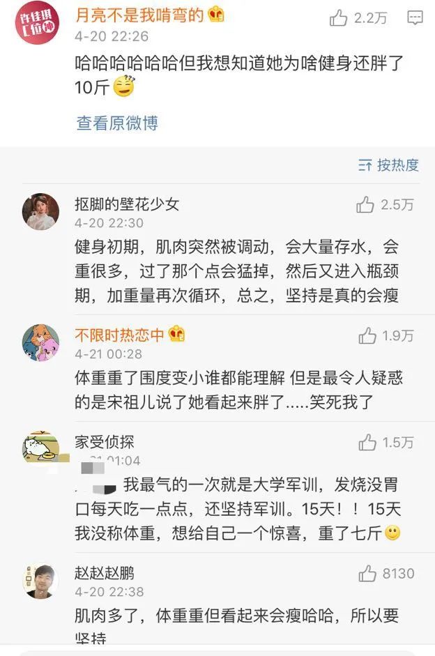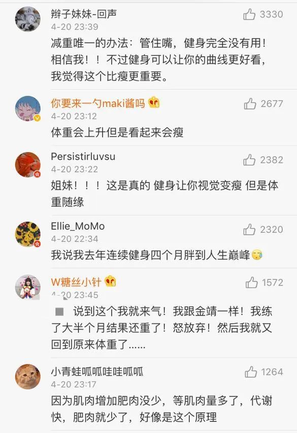 金靖在讲述中逐渐暴躁,“教练和我说不要在锻炼初期去称体重,因为健身会让你变重。然后我健身了三个星期,每天健身有氧加无氧有一个半小时到2个小时,而且有时候是空腹的。前几天我和宋祖儿吃饭,她说我是不是胖了。我就没忍住上了体重秤,天塌了,115斤!我三个礼拜从104长到了115斤!”