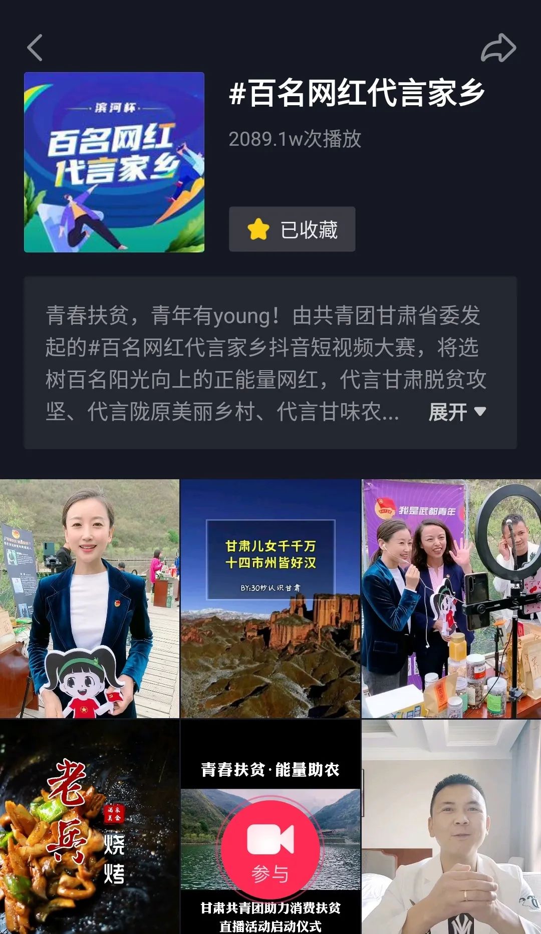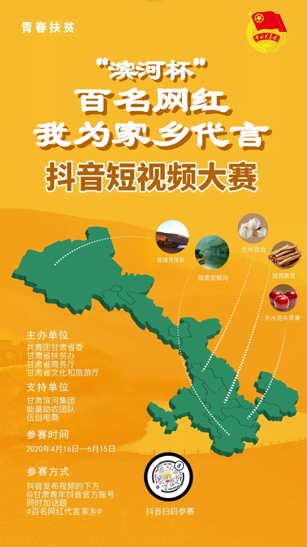 为展示我省脱贫攻坚和乡村振兴一线蓬勃朝气和青春形象,展示甘陇大地的人文历史、美丽风光、丰饶物产与淳朴民风,推介“甘味”农产品,4月16日,团省委、省扶贫办、省商务厅、省文旅厅联合举办了“百名网红·我为家乡代言”抖音短视频大赛,用短视频记录全省各地脱贫攻坚成果、乡村新风新貌,宣传甘肃悠久的历史文化、美丽的自然风光和各地特色农产品,选树100名阳光向上的正能量网红,代言甘肃脱贫攻坚、代言陇原美丽乡村、代言甘味农产品,通过大赛引流开展网络直播销售,助力消费扶贫。