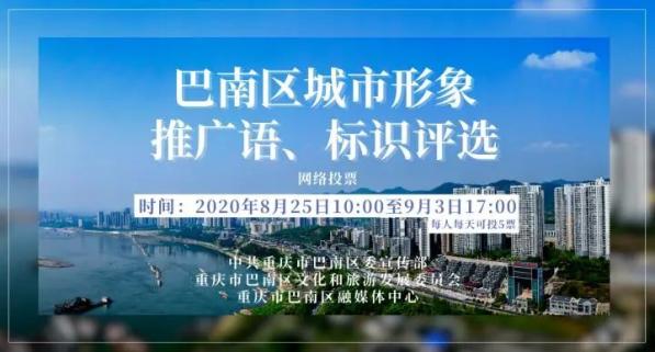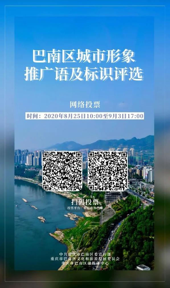 本次投票活动时间为2020年8月25日10:00至9月3日17:00。届时,各位网友可登陆“看巴南”客户端,在首页“巴南区城市形象推广语及标识评选网络投票”版块参加投票。本次投票分“城市形象推广语”“城市形象标识”两个通道,每个通道每天最多可投5票。