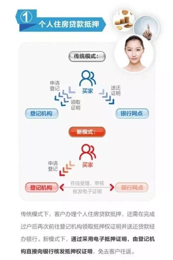 包括两个方面:一是,抵押双方与登记机构“不见面”。适用于持证抵押和抵押权注销,市民和企业在银行网点办理贷款的同时,直接申请办理抵押登记或由银行直接申请抵押注销;二是,银行与登记机构“不见面”。主要适用于个人住房贷款抵押登记,买卖双方在登记中心申请转移登记的同时,买家同步提交抵押登记申请,登记机构根据买家申请匹配银行在线提交的抵押登记申请。登记审核完成后,银行可打印电子登记证明,无需再跑登记中心。