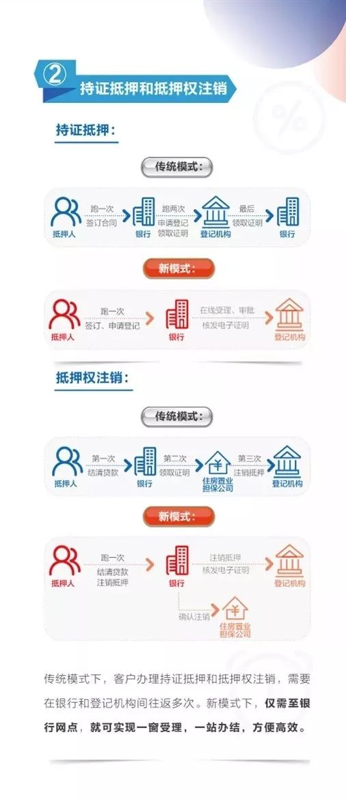 优化前,办理持证抵押和抵押权注销,需要在银行和登记机构间往返多次;优化后,仅需到银行网点跑一次,就可办理全部业务手续,方便快捷。【案例分析】我们以商业+公积金贷款的抵押权注销为例:小明在购房时候办理了商业和公积金组合贷款,并办理了抵押登记。在贷款全部还清后,他首先要去银行办理商业贷款结清证明,取得银行授权办理抵押权注销的委托书;然后再去公积金中心办理公积金贷款结清证明;最后到登记中心,提交申请材料,办理抵押权注销。