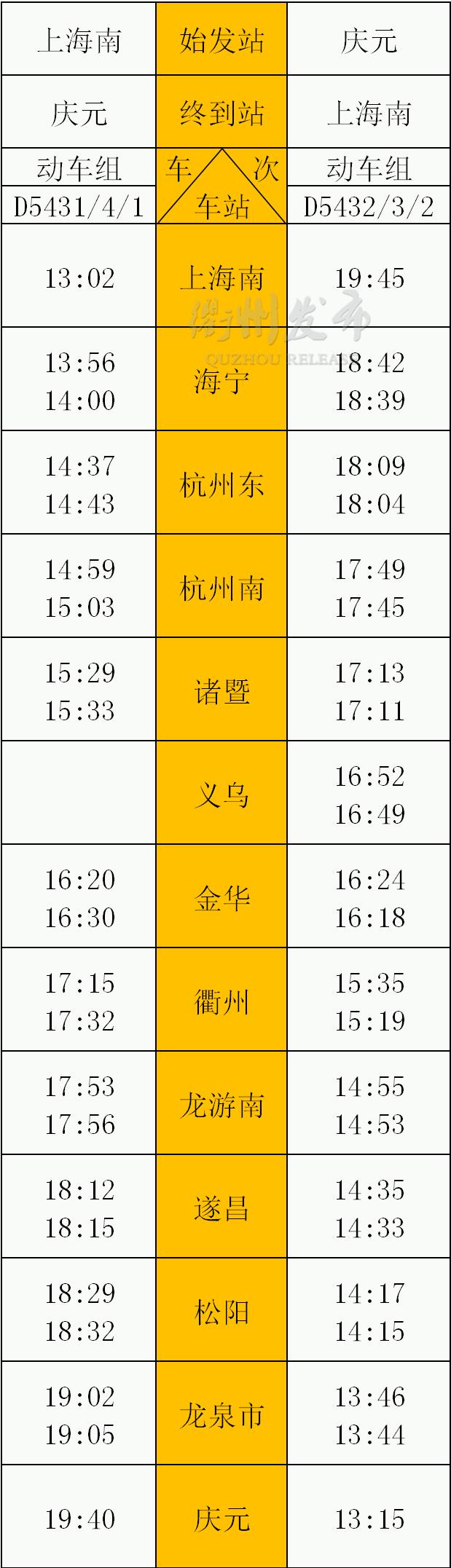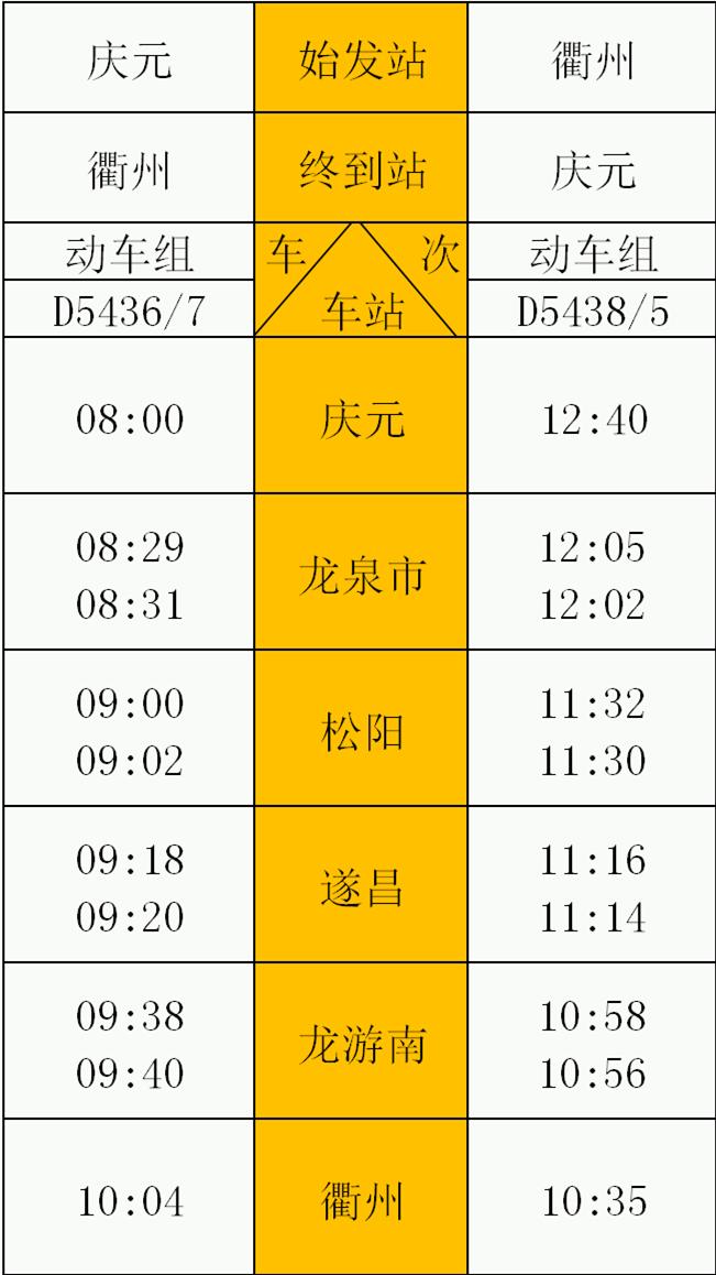 衢州至庆元动车组约耗时两小时,二等座票价为56元;而衢州至宁德列车的时刻表也在陆续上线中。