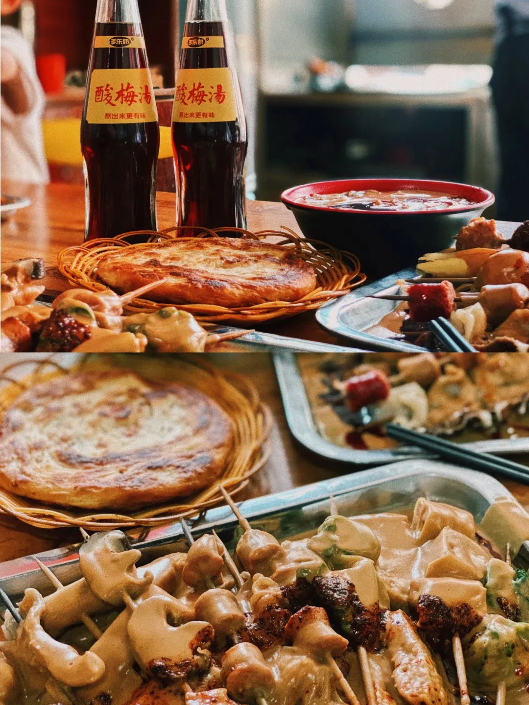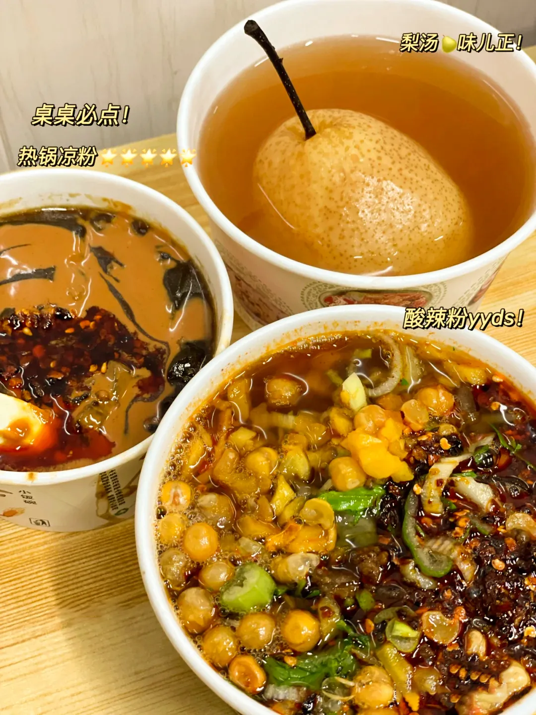大锅里的梨子排排队,舀一颗梨,浇一勺汤,能喝到山楂生姜加冰糖的独特风味。再来一口全家福肉夹馍,吸溜一碗小凉皮,俩字儿,舒坦!