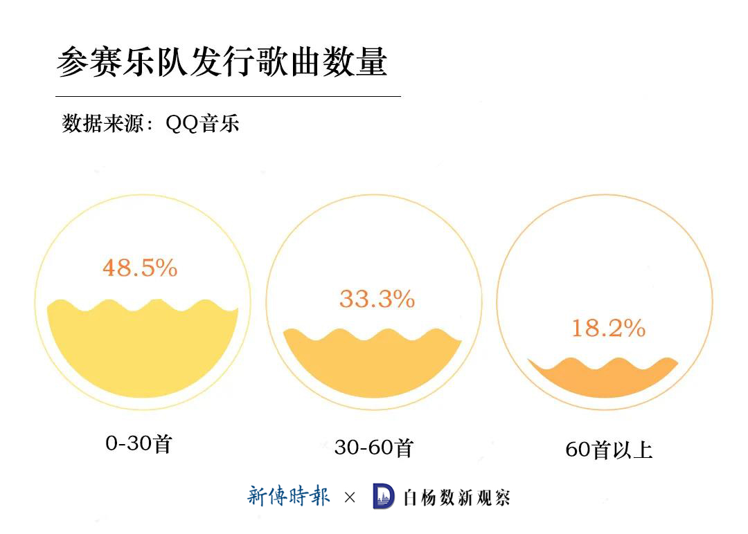 在33支参赛乐队中,有将近一半的乐队发行歌曲数量集中在0-30首,三分之一的乐队发行歌曲数量为30-60首。这反映出《乐夏2》参赛乐队的整体特征:在乐坛初露头角,有一定的音乐积累。