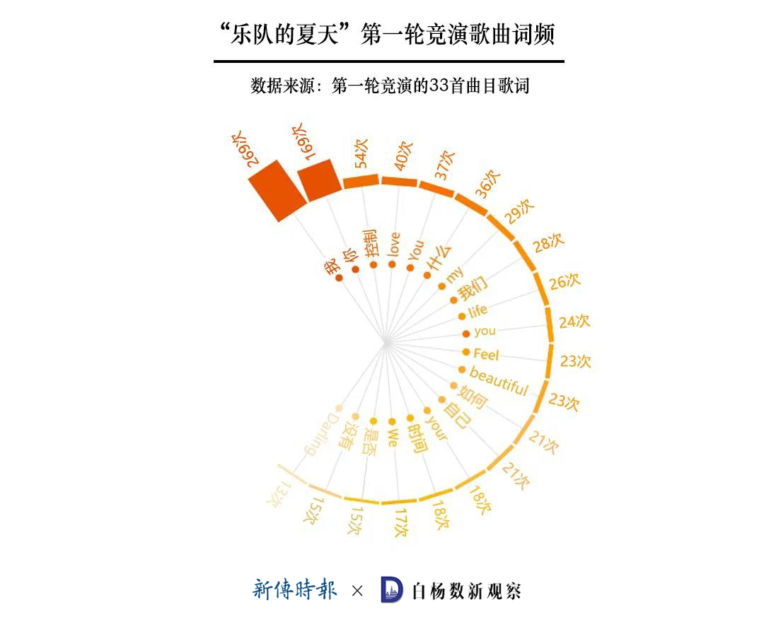 33首竞演曲目共有15首涉及英文歌词,占总体的45.5%。英文歌词的融入也反映在词频上,如Top10词频中就有5个关键词为英文。
