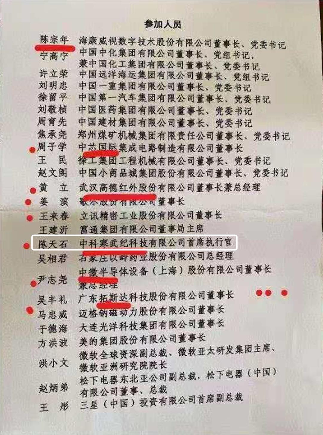 其四、7月21日,最高层主持召开企业家座谈会,寒武纪首席执行官陈天石出席。