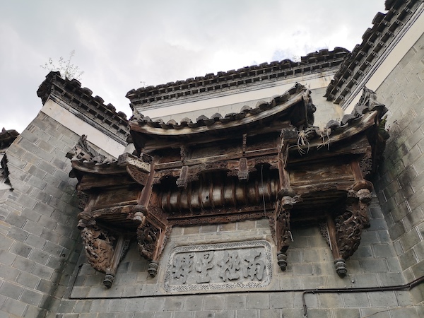 大块条石砌成的门楼上罕有江南其他地区更常用的砖雕,多是精致的木雕构建,以梁、枋、檐、望板和垂帘虚柱构成四柱三楼式。一路走来,木雕多为福禄寿与和合二仙等,寓意吉祥。门楼上覆黛瓦,两侧檐角飞翘。