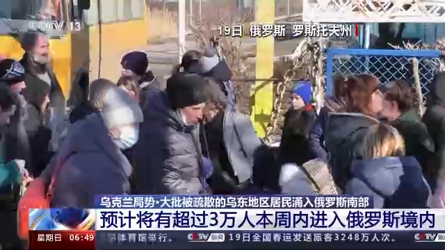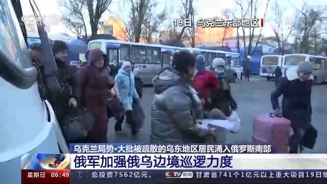 总台记者 徐鸿波:我现在所处的位置是俄罗斯罗斯托夫州,乌克兰东部顿涅茨克和卢甘斯克的居民在当地时间2月19日陆续搭乘十多列火车撤离到俄罗斯境内,列车上主要为老人、儿童和陪伴孩子的母亲。另外还有不少乌克兰东部居民乘坐大巴进入罗斯托夫州,目前他们大多被暂时安置在俄乌边境的临时居住点。