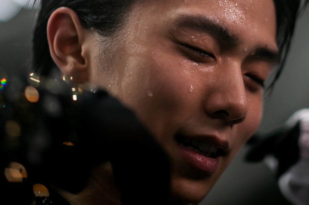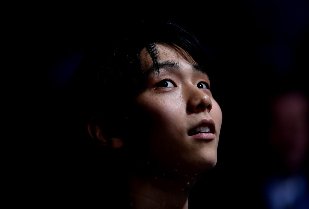 2018年11月17日,2018/2019赛季花样滑冰大奖赛俄罗斯站,羽生结弦赛后满脸汗水。