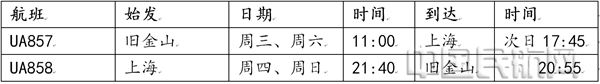 复航后,具体航班信息为,UA857航班于每周三和每周六当地时间11时从旧金山起飞,次日17时45分到达上海。UA858航班于每周四和每周日当地时间21时40分从上海出发,当地时间当日20时55分抵达旧金山。