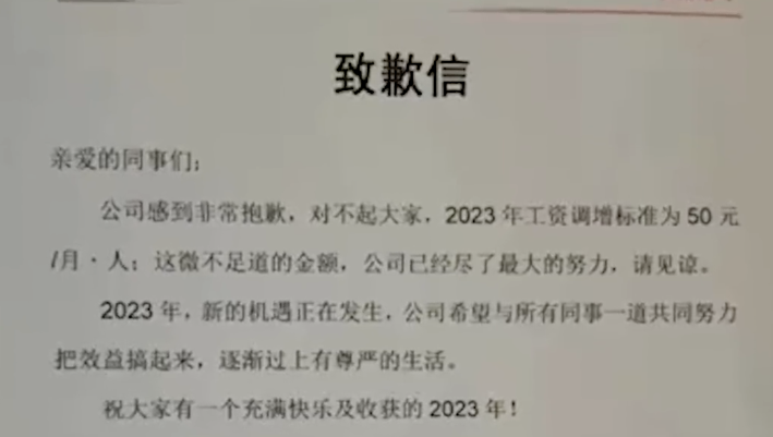 近日,重庆一家公司就给员工加薪50元道歉:“对不起大家,这微不足道的金额,公司已经尽了最大努力。”此事迅速引发社会关注,读者、网友纷纷为这家有担当、有诚意的公司叫好。该公司回应称,加薪涉及6000多名员工,每年都会给员工加薪,今年数额较少,究其原因,是因为公司效益没有达到预期。该公司觉得对不起员工,便用致歉的方式希望得到员工的理解。这一封诚意满满的致歉信,令许多读者、网友心生感慨。正如网友评论所言,这家公司“很良心”。对于多数员工来说,经济待遇固然重要,但并非是自己人生的唯一追求,很多时候他们更关注自己能否愉快、有尊严地工作,能否享有合法权益和人文关怀。