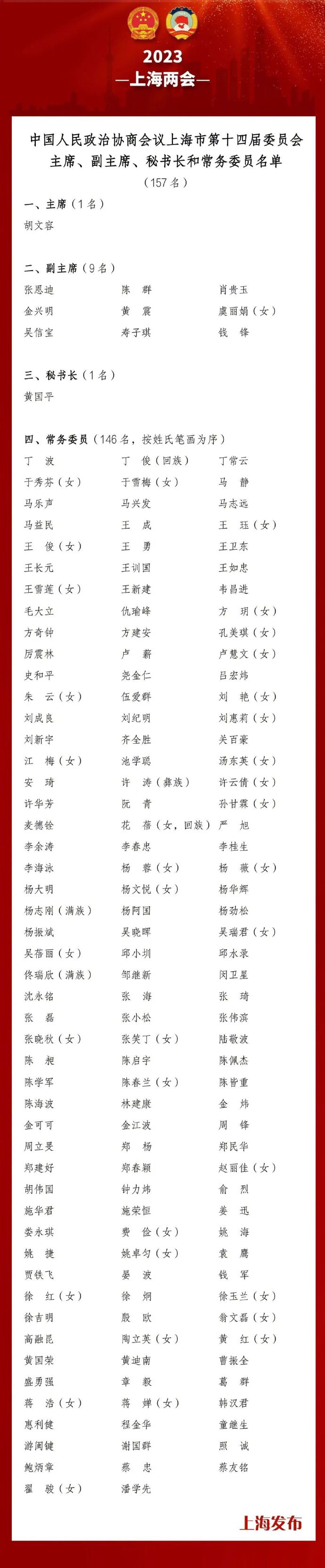 1月14日,上海市政协十四届一次会议举行全体会议,审议通过选举办法,总监票人、监票人名单,选举产生十四届市政协主席胡文容,副主席张恩迪、陈群、肖贵玉、金兴明、黄震、虞丽娟、吴信宝、寿子琪、钱锋,秘书长黄国平,以及146名常务委员。